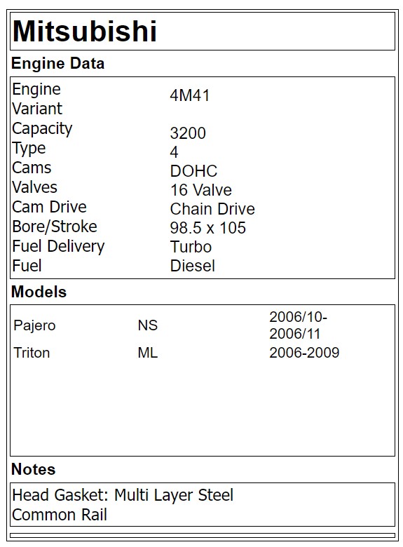 4M41 4Cyl DOHC16v TD2002 2008 on SuiteMitsubishiPajeroNM NP NS NT NW NX TritonML