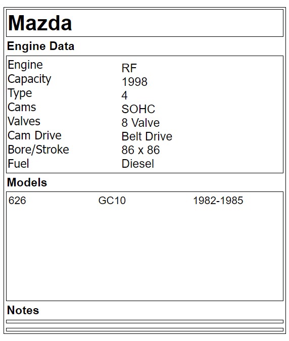 RF 4 Cyl SOHC 8v Diesel 1982 1991 on Suit Mazda 626