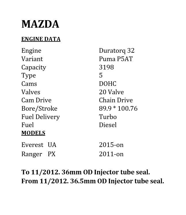 Make Model Year Submodel Variant Engine Ford Everest 2020 UA,UAII SUV 3.2 TDCi RWD Diesel 3.2L 5cyl 143kW P5-AT 3198cc 143kW (Diesel) Ford Ranger 2020 PX Platform/Chassis 3.2 TDdi 4x4 AWD Diesel 3.2L 5cyl 147kW P5-AT 3198cc 147kW (Diesel) Ford Ranger 2020 PX Ute 3.2 TDdi RWD Diesel 3.2L 5cyl 147kW P5-AT 3198cc 147kW (Diesel) Ford Ranger 2020 PX Ute 3.2 TDdi 4x4 AWD Diesel 3.2L 5cyl 147kW P5-AT 3198cc 147kW (Diesel) Mazda BT-50 2020 B22,B32,UP,UR Platform/Chassis 3.2 MZ-CD RWD Diesel 3.2L 5cyl 147kW P5-AT 3198cc 147kW (Diesel) Mazda BT-50 2020 B22,B32,UP,UR Platform/Chassis 3.2 MZ-CD 4WD AWD Diesel 3.2L 5cyl 147kW P5-AT 3198cc 147kW (Diesel) Mazda BT-50 2020 B22,B32,UP,UR Ute 3.2 MZ-CD RWD Diesel 3.2L 5cyl 147kW P5-AT 3198cc 147kW (Diesel) Mazda BT-50 2020 B22,B32,UP,UR Ute 3.2 MZ-CD 4WD AWD Diesel 3.2L 5cyl 147kW P5-AT 3198cc 147kW (Diesel) Ford Everest 2019 UA,UAII SUV 3.2 TDCi RWD Diesel 3.2L 5cyl 143kW P5-AT 3198cc 143kW (Diesel) Ford Ranger 2019 PX Platform/Chassis 3.2 TDdi 4x4 AWD Diesel 3.2L 5cyl 147kW P5-AT 3198cc 147kW (Diesel) Ford Ranger 2019 PX Ute 3.2 TDdi RWD Diesel 3.2L 5cyl 147kW P5-AT 3198cc 147kW (Diesel) Ford Ranger 2019 PX Ute 3.2 TDdi 4x4 AWD Diesel 3.2L 5cyl 147kW P5-AT 3198cc 147kW (Diesel) Mazda BT-50 2019 B22,B32,UP,UR Platform/Chassis 3.2 MZ-CD RWD Diesel 3.2L 5cyl 147kW P5-AT 3198cc 147kW (Diesel) Mazda BT-50 2019 B22,B32,UP,UR Platform/Chassis 3.2 MZ-CD 4WD AWD Diesel 3.2L 5cyl 147kW P5-AT 3198cc 147kW (Diesel) Mazda BT-50 2019 B22,B32,UP,UR Ute 3.2 MZ-CD RWD Diesel 3.2L 5cyl 147kW P5-AT 3198cc 147kW (Diesel) Mazda BT-50 2019 B22,B32,UP,UR Ute 3.2 MZ-CD 4WD AWD Diesel 3.2L 5cyl 147kW P5-AT 3198cc 147kW (Diesel) Ford Everest 2018 UA,UAII SUV 3.2 TDCi RWD Diesel 3.2L 5cyl 143kW P5-AT 3198cc 143kW (Diesel) Ford Ranger 2018 PX Platform/Chassis 3.2 TDdi 4x4 AWD Diesel 3.2L 5cyl 147kW P5-AT 3198cc 147kW (Diesel) Ford Ranger 2018 PX Ute 3.2 TDdi RWD Diesel 3.2L 5cyl 147kW P5-AT 3198cc 147kW (Diesel) Ford Ranger 2018 PX Ute 3.2 TDdi 4x4 AWD Diesel 3.2L 5cyl 147kW P5-AT 3198cc 147kW (Diesel) Mazda BT-50 2018 B22,B32,UP,UR Platform/Chassis 3.2 MZ-CD RWD Diesel 3.2L 5cyl 147kW P5-AT 3198cc 147kW (Diesel) Mazda BT-50 2018 B22,B32,UP,UR Platform/Chassis 3.2 MZ-CD 4WD AWD Diesel 3.2L 5cyl 147kW P5-AT 3198cc 147kW (Diesel) Mazda BT-50 2018 B22,B32,UP,UR Ute 3.2 MZ-CD RWD Diesel 3.2L 5cyl 147kW P5-AT 3198cc 147kW (Diesel) Mazda BT-50 2018 B22,B32,UP,UR Ute 3.2 MZ-CD 4WD AWD Diesel 3.2L 5cyl 147kW P5-AT 3198cc 147kW (Diesel) Ford Everest 2017 UA,UAII SUV 3.2 TDCi RWD Diesel 3.2L 5cyl 143kW P5-AT 3198cc 143kW (Diesel) Ford Ranger 2017 PX Platform/Chassis 3.2 TDdi 4x4 AWD Diesel 3.2L 5cyl 147kW P5-AT 3198cc 147kW (Diesel) Ford Ranger 2017 PX Ute 3.2 TDdi RWD Diesel 3.2L 5cyl 147kW P5-AT 3198cc 147kW (Diesel) Ford Ranger 2017 PX Ute 3.2 TDdi 4x4 AWD Diesel 3.2L 5cyl 147kW P5-AT 3198cc 147kW (Diesel) Mazda BT-50 2017 B22,B32,UP,UR Platform/Chassis 3.2 MZ-CD RWD Diesel 3.2L 5cyl 147kW P5-AT 3198cc 147kW (Diesel) Mazda BT-50 2017 B22,B32,UP,UR Platform/Chassis 3.2 MZ-CD 4WD AWD Diesel 3.2L 5cyl 147kW P5-AT 3198cc 147kW (Diesel) Mazda BT-50 2017 B22,B32,UP,UR Ute 3.2 MZ-CD RWD Diesel 3.2L 5cyl 147kW P5-AT 3198cc 147kW (Diesel) Mazda BT-50 2017 B22,B32,UP,UR Ute 3.2 MZ-CD 4WD AWD Diesel 3.2L 5cyl 147kW P5-AT 3198cc 147kW (Diesel) Ford Everest 2016 UA,UAII SUV 3.2 TDCi RWD Diesel 3.2L 5cyl 143kW P5-AT 3198cc 143kW (Diesel) Ford Ranger 2016 PX Platform/Chassis 3.2 TDdi 4x4 AWD Diesel 3.2L 5cyl 147kW P5-AT 3198cc 147kW (Diesel) Ford Ranger 2016 PX Ute 3.2 TDdi RWD Diesel 3.2L 5cyl 147kW P5-AT 3198cc 147kW (Diesel) Ford Ranger 2016 PX Ute 3.2 TDdi 4x4 AWD Diesel 3.2L 5cyl 147kW P5-AT 3198cc 147kW (Diesel) Mazda BT-50 2016 B22,B32,UP,UR Platform/Chassis 3.2 MZ-CD RWD Diesel 3.2L 5cyl 147kW P5-AT 3198cc 147kW (Diesel) Mazda BT-50 2016 B22,B32,UP,UR Platform/Chassis 3.2 MZ-CD 4WD AWD Diesel 3.2L 5cyl 147kW P5-AT 3198cc 147kW (Diesel) Mazda BT-50 2016 B22,B32,UP,UR Ute 3.2 MZ-CD RWD Diesel 3.2L 5cyl 147kW P5-AT 3198cc 147kW (Diesel) Mazda BT-50 2016 B22,B32,UP,UR Ute 3.2 MZ-CD 4WD AWD Diesel 3.2L 5cyl 147kW P5-AT 3198cc 147kW (Diesel)