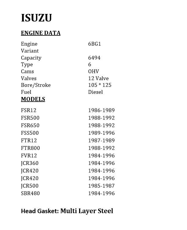 6BG1 12V Isuzu Gasket kit