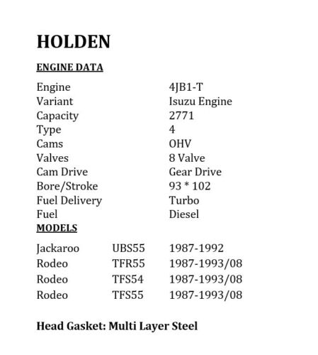 Holden Rodeo Jackaroo 4JB1-T Diesel Engine Full Gasket Kit, UBS55, TFR55, TFS54