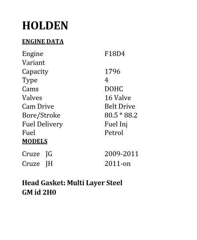 F18D4 Gasket kit Fits Holden Cruz JG/ JH