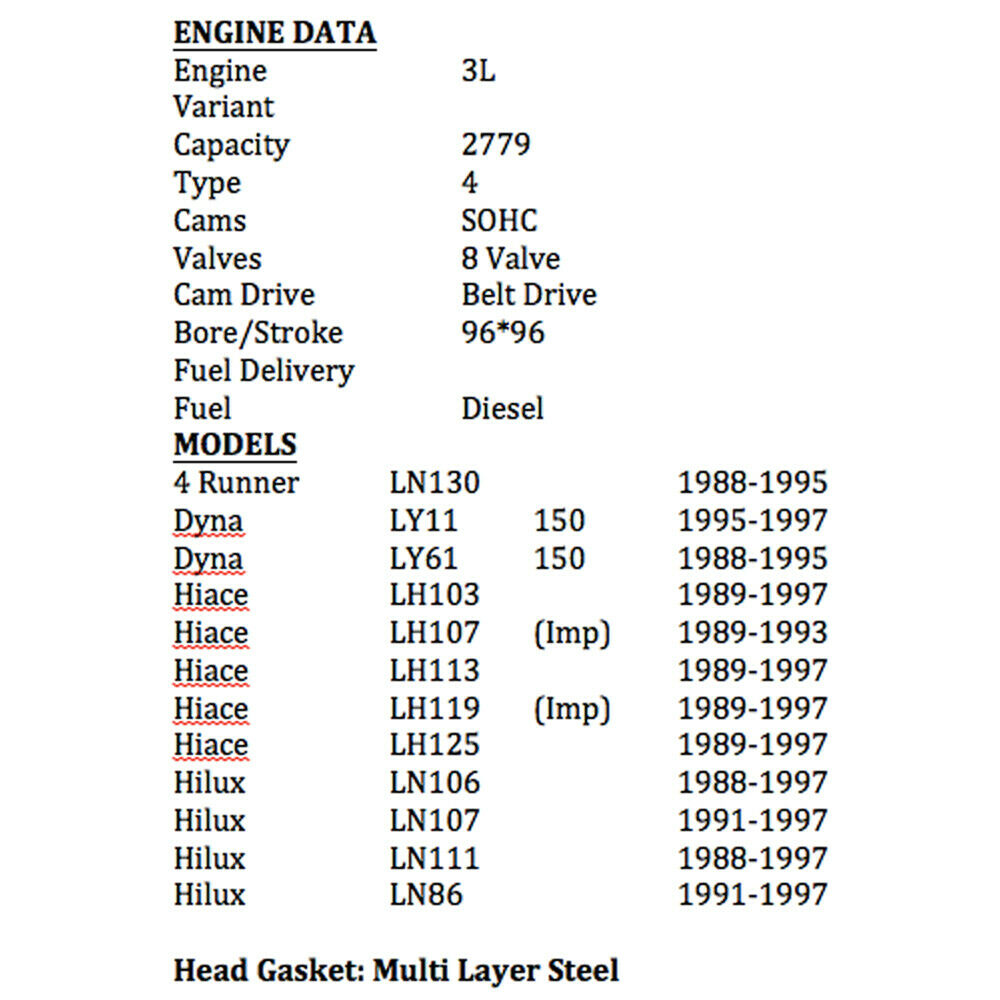 3L 8v SOHC FULL GASKET KIT SUITS TOYOTA 4 RUNNER DYNA HIACE HILUX SURF